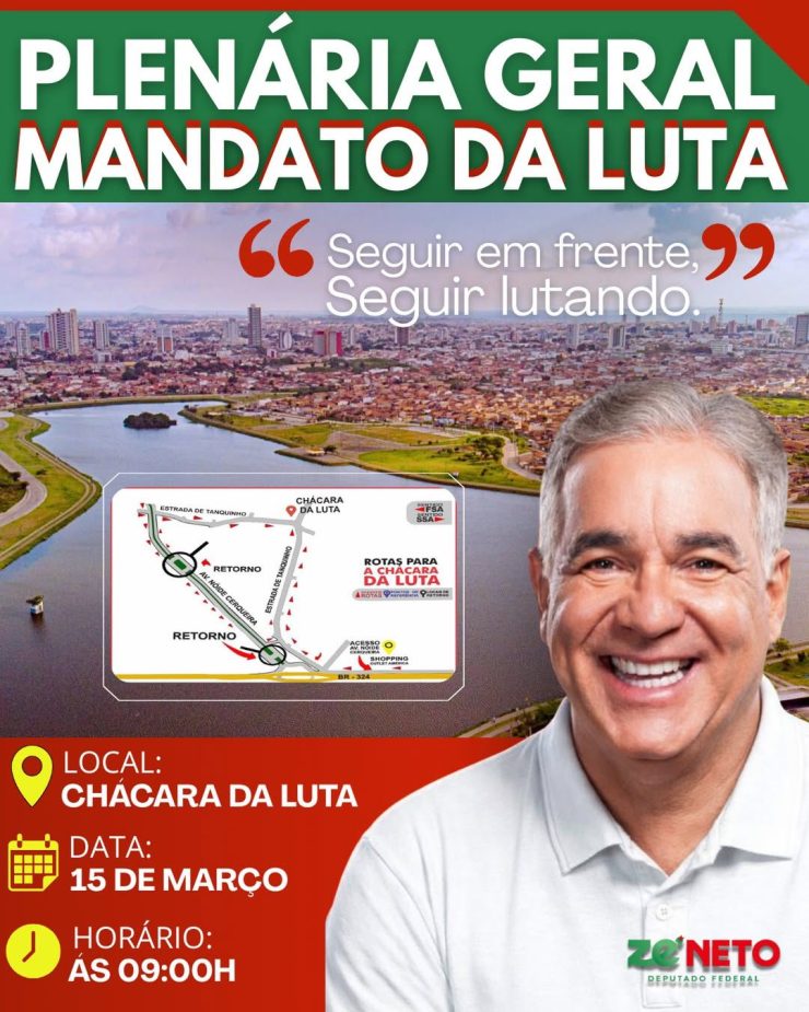 [11:48, 05/04/2026] Bruna : O deputado federal Zé Neto (PT) promove, no dia 15 de março, a partir das 9h, na Chácara da Luta, em Feira de Santana, a Plenária Geral do Mandato da Luta. O encontro reunirá lideranças políticas, representantes de movimentos sociais e das comunidades, apoiadores e parceiros de diversos municípios da Bahia para um momento de diálogo, avaliação de cenário e organização das próximas etapas da caminhada política.